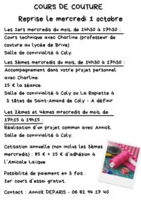 Si vous aimez la couture et que vous voulez partager un moment agréable entre couturières, apprendre ou perfectionner votre technique et échanger des idées de projets et si en plus vous êtes libres les mercredis, ces cours sont faits pour vous! 🙂