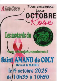 Le 04 octobre à l’occasion d’octobre rose les motards du motoclub les cromagnons en association avec le Comité féminin de Dordogne vous attendent de 10h35 à 10h50 devant la mairie. Une urne sera déposée au point information pour les dons au profit de la recherche contre le cancer du sein.