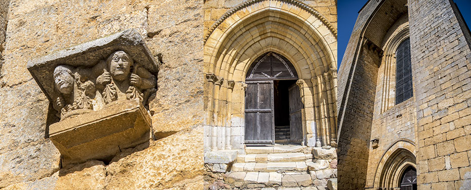 Le tout est souligné d’une archivolte à pointes de diamant. Deux chapiteaux de réemploi sont sculptés de porteurs.
